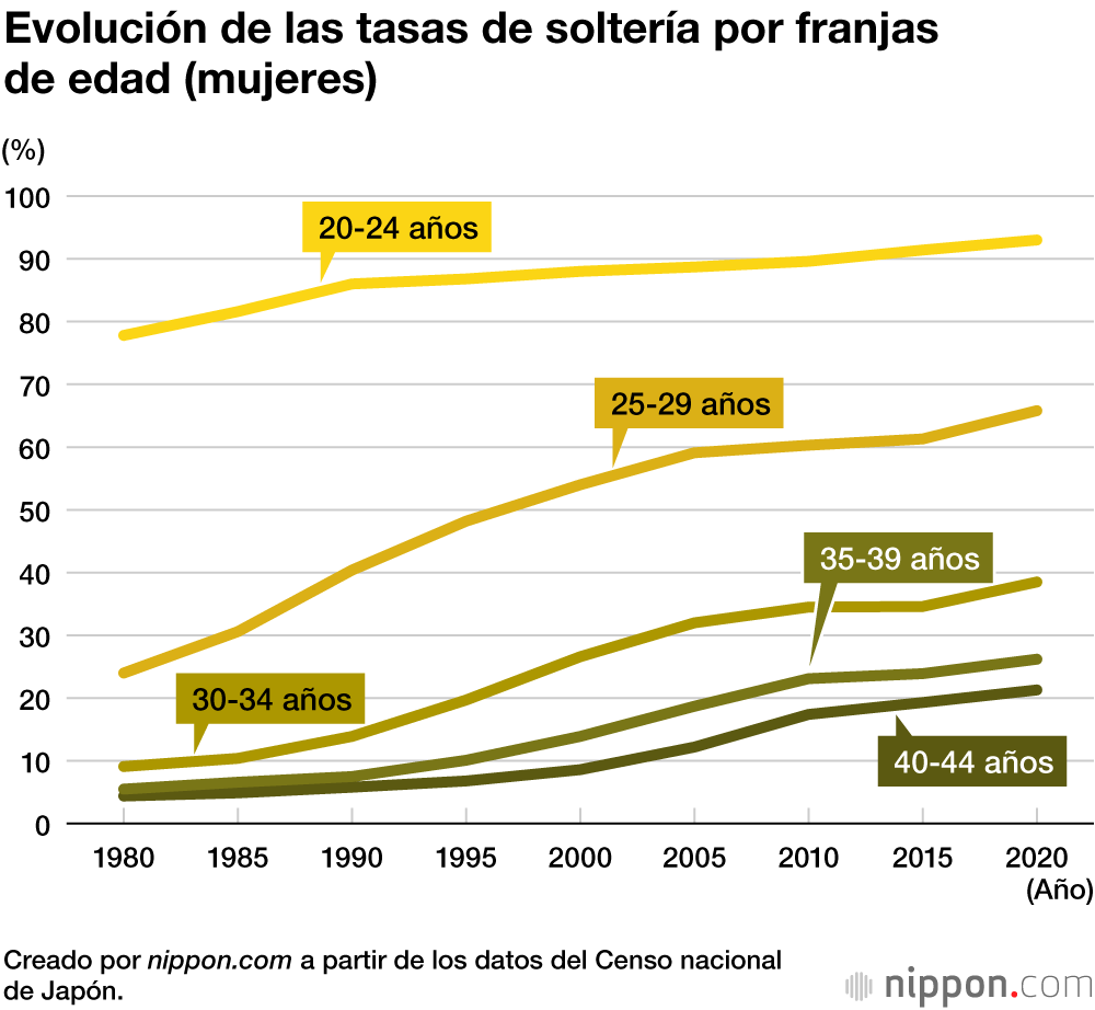 En 1980, solo el 9,1 % de las mujeres de entre 30 y 34 años no habían contraído matrimonio, lo que significa que el 90 % de las mujeres estaban ya casadas antes de los 30 años. Desde entonces, la tasa de soltería ha aumentado lentamente. En 2020, la tasa de soltería entre las mujeres de 30 a 34 años fue del 38,5 %, lo que significa que ya no es raro que las mujeres no estén casadas en su veintena.