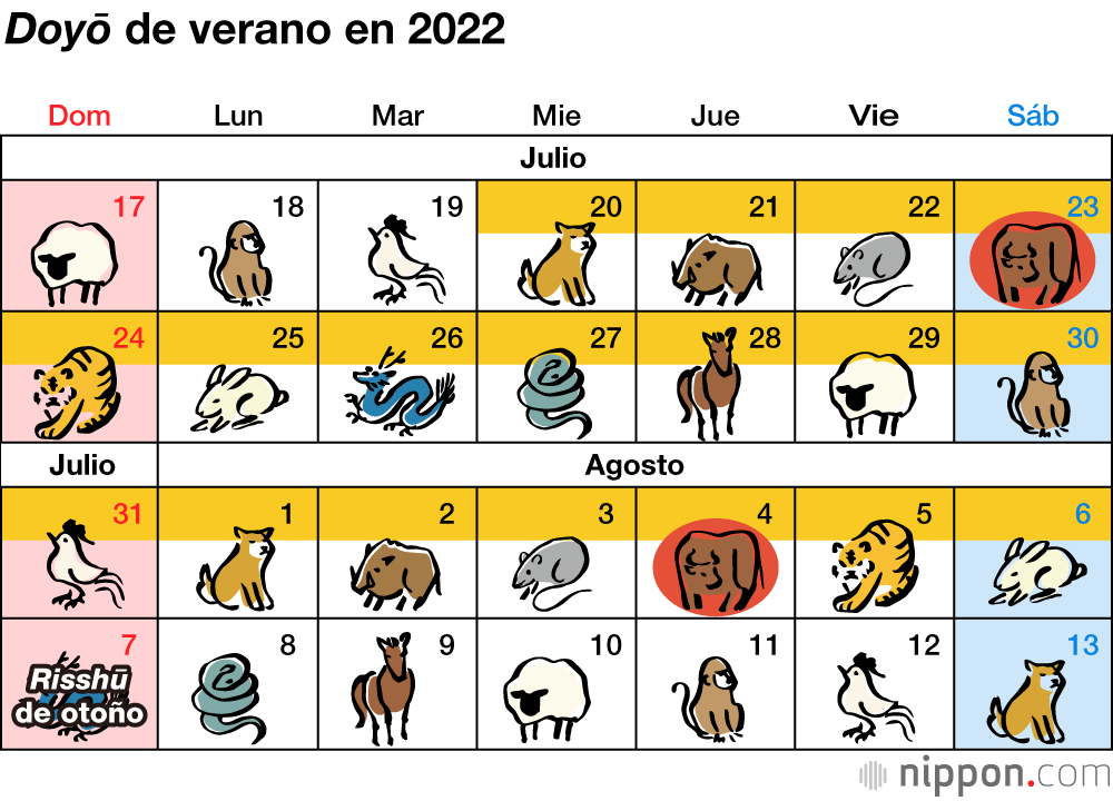 El uso de los doce signos del zodiaco chino para caracterizar cada año es familiar en Japón. Se suele escuchar “Este es el año del tigre” o “Ambos nacimos en el año del perro, solo que con 12 años de diferencia”, aunque originalmente el sistema del calendario chino también utilizaba los doce signos para representar los días y los meses. Si aplicamos los signos a los días, encontramos que durante el período de 18 días de doyō, el día del buey aparece al menos una vez, y dos veces cada pocos años. A continuación, les mostramos las fechas del Doyō ushi no hi para este año.