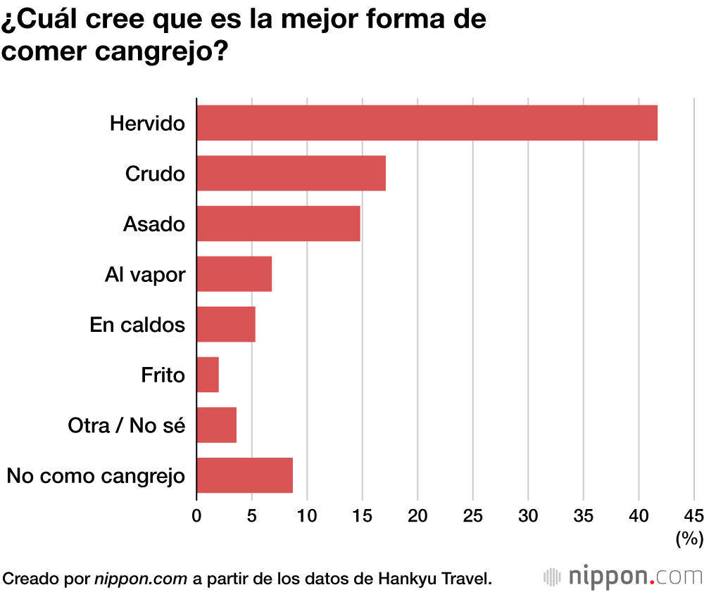 Con respecto a la pregunta “¿Cuál cree que es la mejor forma de comer cangrejo?”, el 41,7 % respondió que es hervido, mientras que, en segundo lugar, el 17,1 % respondió que es crudo. Aunque en general no obtuvo un gran porcentaje, el cangrejo frito fue elegido por muchas personas, especialmente en Shizuoka, Aichi y Mie, en la región de Tōkai.
