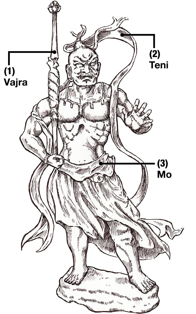 (1) El vajra es un arma con forma de palo que se utiliza para combatir el mal. (2) El teni es una túnica celestial que llevan las deidades. (3) El mo es una prenda que se lleva de cintura para abajo (PIXTA).