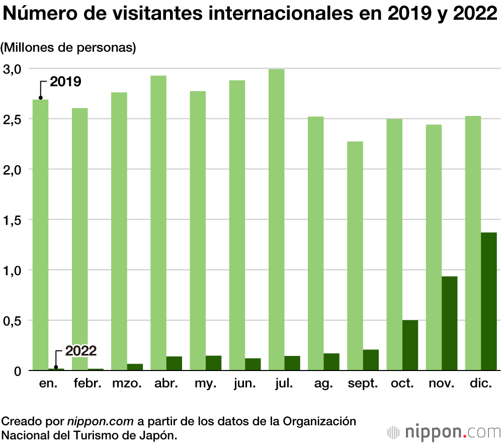 De acuerdo con los datos de la Organización Nacional del Turismo de Japón (JNTO, por sus siglas en inglés), Japón recibió en 2022 a 3.831.900 turistas extranjeros, unas 15 veces más que en 2021. La retirada de las restricciones por la COVID-19 trajo consigo una recuperación significativa, aunque la cifra de 2022 solo representa un 10 % del total registrado en 2019, justo antes de la pandemia.