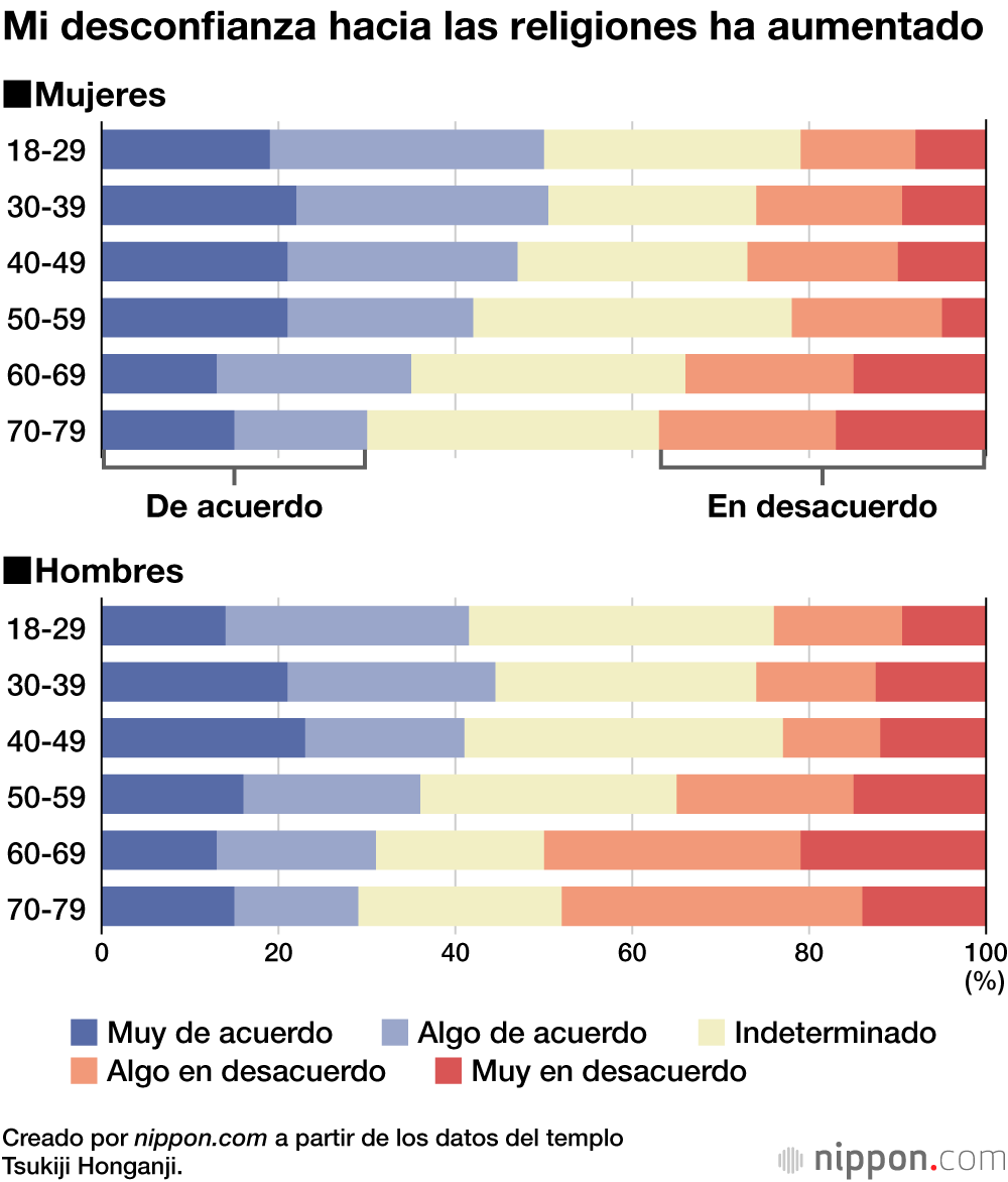 En una encuesta sobre actitudes hacia la religión y el budismo que el templo Tsukiji Honganji (distrio de Chuō, Tokio) llevó a cabo entre 1.600 personas de todo el país, el 39,7 % de todos los encuestados respondieron que su desconfianza hacia la religión había aumentado en los últimos uno o dos años. En especial, alrededor del 50 % de las mujeres de entre 10 y 49 años afirmaron que su desconfianza había aumentado.