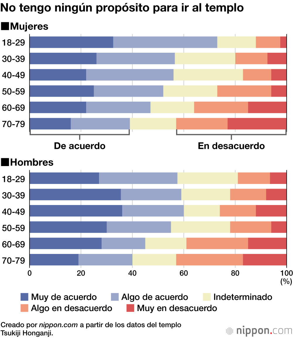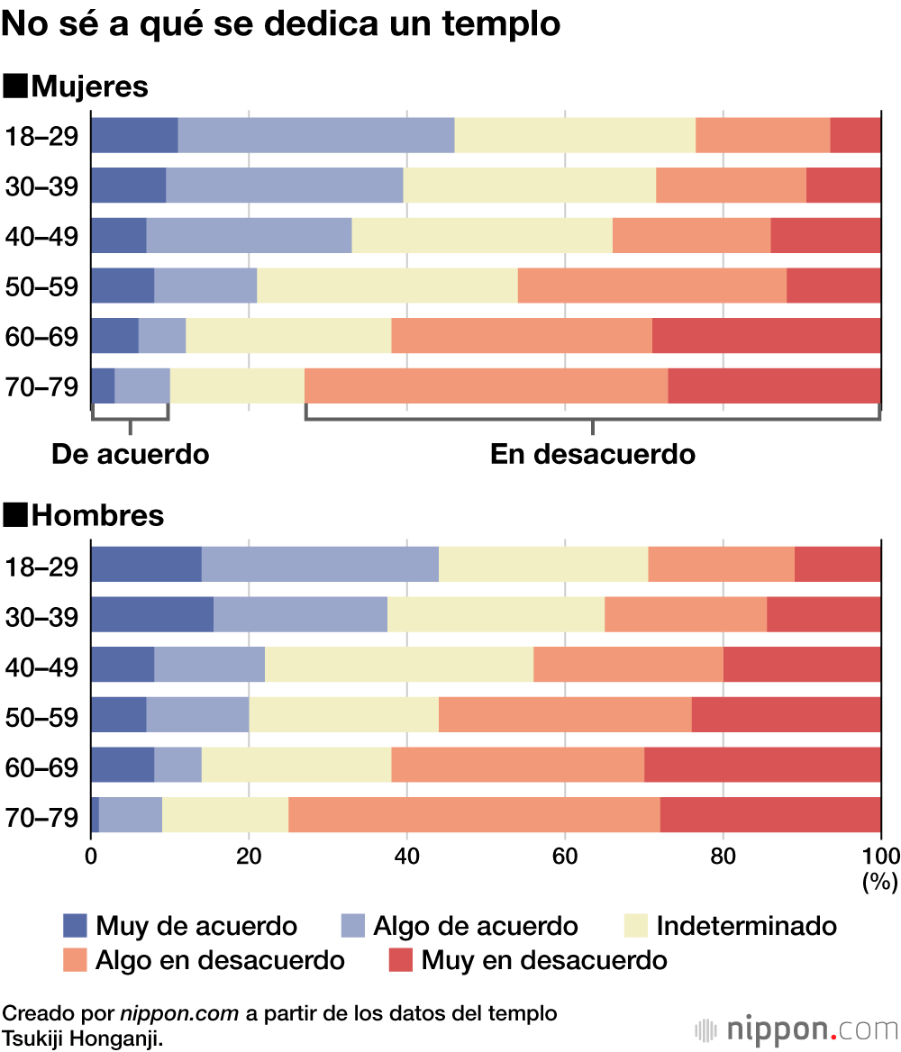 Cuando se les preguntó por sus impresiones sobre las “religiones” y el “budismo” respectivamente, muchos encuestados se mostraron menos reacios al “budismo” y se sintieron más familiarizados con él, pero casi la mitad de los encuestados confesaron que nos les genera “ninguna impresión”, lo que el templo Tsukiji Honganji calificó como “indicativo de que tienen una relación poco profunda con el budismo y no tienen impresiones ni positivas ni negativas sobre el mismo”.