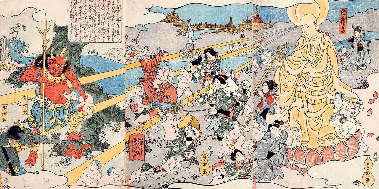 Sai no kawara jizōson, pintado por Utagawa Kuniteru, finales del periodo Edo. El cuadro representa a un ogro acosando a unos niños a la izquierda y a un jizō bosatsu salvándolos a la derecha. Colección de la Sala de Colecciones Especiales de la Biblioteca Central Metropolitana de Tokio.