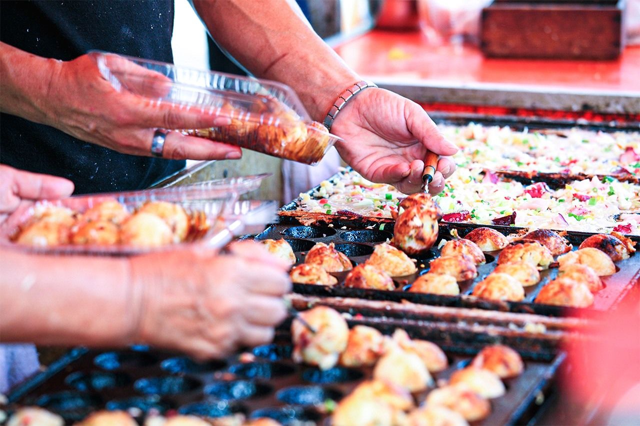 En una plancha con varios orificios redondos se echa una masa de harina con huevo, caldo dashi, trozos de pulpo y frituras agedama para ser asada mientras se le da una forma redonda. Es un plato típico de los puestos callejeros, pero también se prepara en muchos hogares de Osaka, lugar donde se dice que cada familia tiene una plancha para hacer takoyaki.