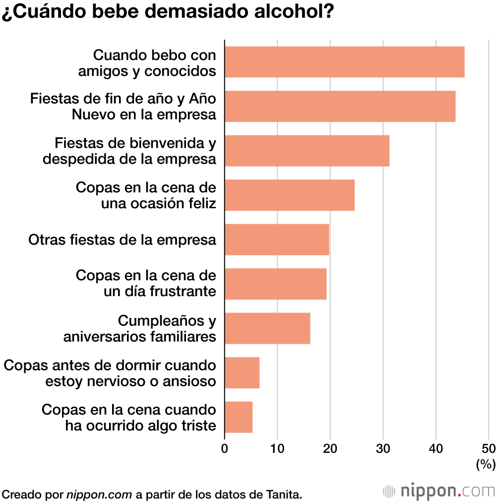 El consumo excesivo de alcohol en las reuniones de amigos y conocidos y en las fiestas de fin de año y Año Nuevo de las empresas fue especialmente frecuente, con un 45,4 % y un 43,7 % respectivamente.
