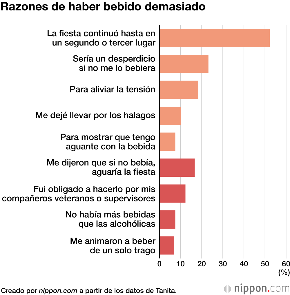 Cuando se preguntó a 228 personas que alguna vez habían bebido demasiado en una fiesta de empresa el porqué, la razón más común fue que la fiesta continuó hasta en un segundo o tercer lugar (52,2 %), seguida de “sería un desperdicio si no bebiera” (23,2 %) y “para aliviar tensiones” (18,4 %).
