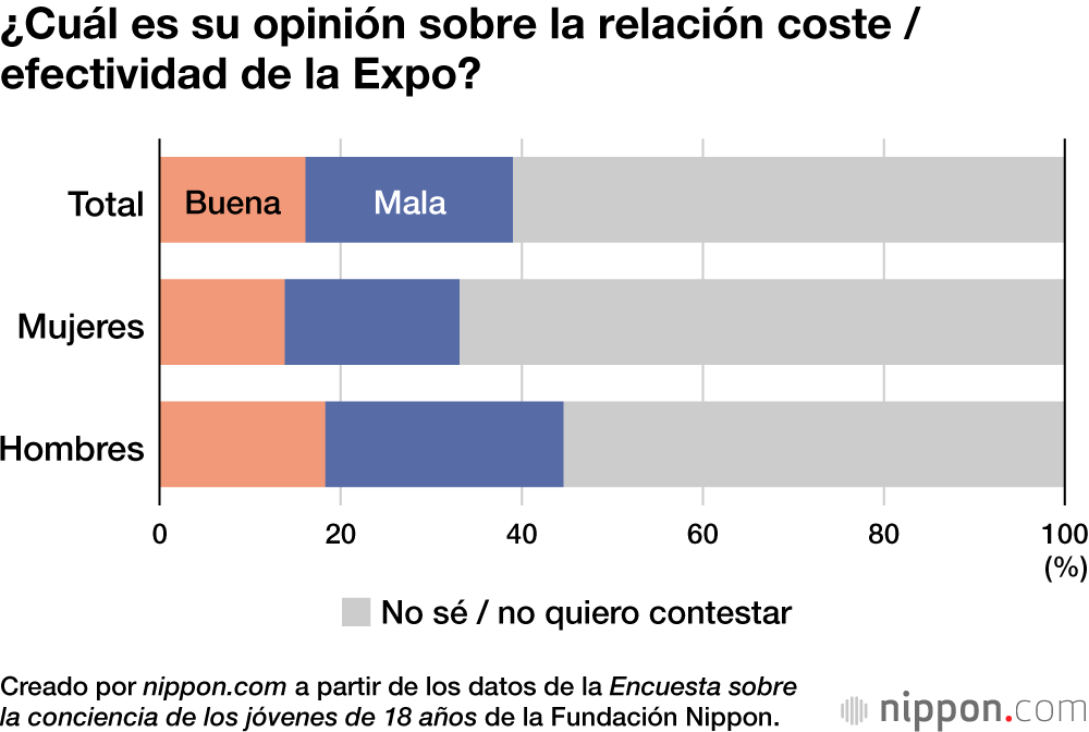 Cuando se preguntó a los encuestados por su opinión sobre la relación coste / efectividad (presupuesto / efectos) de la Expo, el 16,1 % dijo que era “buena”, y el 22,9 % que era “mala”, lo cual indica que un cierto número de personas favorables a la celebración de la Expo de Osaka también estaban preocupadas por esa relación coste / efectividad del acontecimiento.