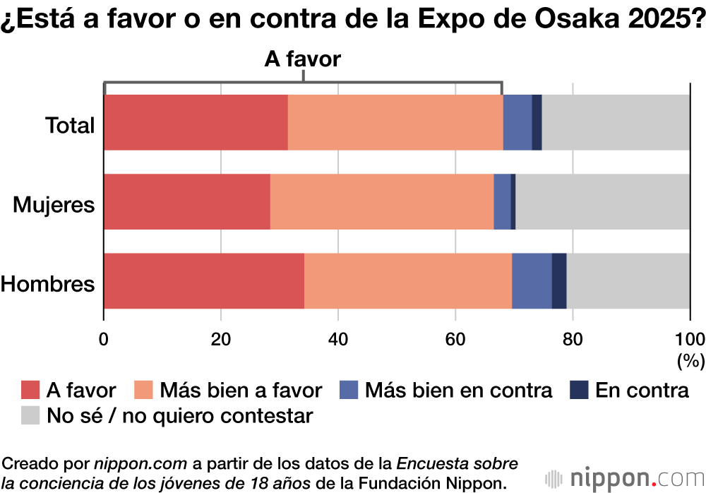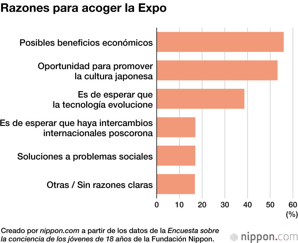 En la Encuesta sobre la conciencia de los jóvenes de 18 años, que la Fundación Nippon lleva a cabo para conocer qué piensan los jóvenes japoneses, se sondeó la opinión de la juventud acerca de la celebración de la Expo. Casi el 70 % de los encuestados se mostró a favor, con un 31,4 % “a favor” y un 36,7 % “algo a favor”. Por el contrario, el 1,7 % se opone y el 4,9 % está más bien en contra. Por sexos, los hombres son menos propensos a responder “No sé / no quiero contestar”, y más que las mujeres a responder tanto “A favor” como “En contra”.