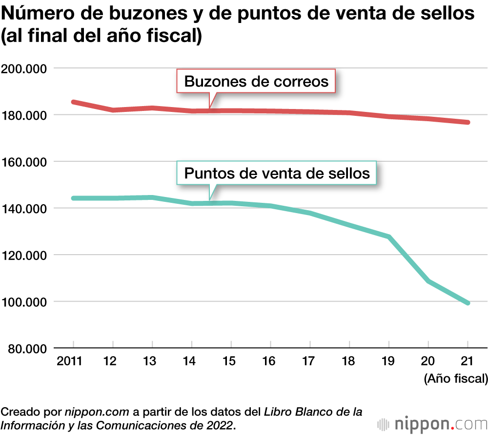En línea con la disminución del correo, el número de tiendas de conveniencia y supermercados que venden sellos y timbres fiscales también ha disminuido: había más de 140.000 puntos de venta en todo el país en el ejercicio 2011, pero a finales del de 2021 había menos de 100.000 puntos de venta. El número de buzones ha disminuido en más de 8.000 en la última década, situándose en unos 176.000 a finales del año fiscal 2021. Según una encuesta realizada por Japan Post, en junio de 2011 había 43.000 buzones (el 25 % del total) con menos de 30 envíos postales colocados al mes, y se están estudiando más reducciones.