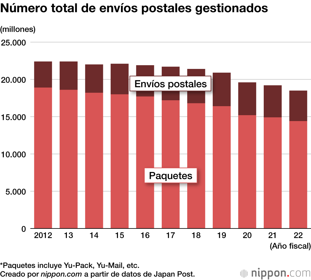 Según el Servicio Postal de Japón (Japan Post), el número de envíos postales recibidos en todo el país en el año fiscal 2022 disminuyó un 2,8 % interanual hasta los 14.445,1 millones de piezas. El número total de envíos postales recibidos, incluyendo paquetes como Yu-pack y Yu-mail, disminuyó un 3,4 % interanual hasta los 18.538.320.000 envíos. En el año fiscal 2023 también siguió una tendencia a la baja, y los resultados de los nueve meses hasta diciembre muestran un descenso interanual del 4,9 % en los envíos postales y del 5,5 % en el número total de envíos recibidos.