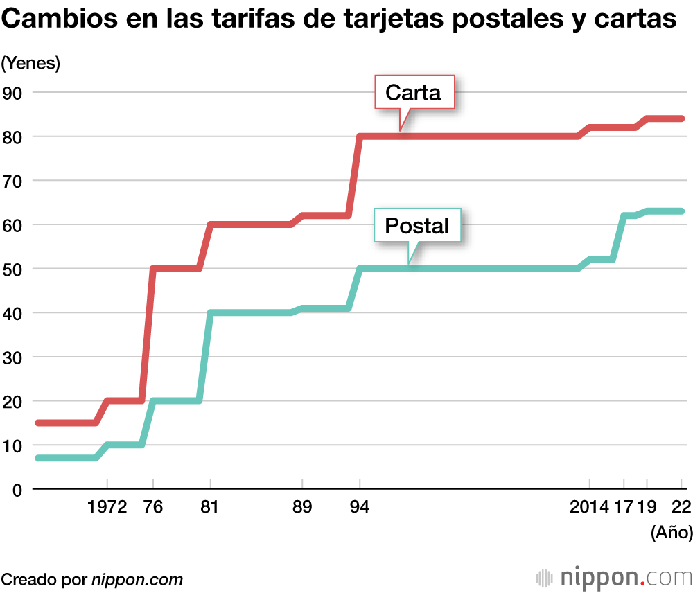 En diciembre de 2023, el Ministerio de Asuntos Internos y Comunicaciones anunció que pretende aumentar el precio de las cartas selladas estándar (de 25 gramos o menos) de los 84 yenes actuales a 110 yenes y el de las tarjetas postales de 63 yenes a 85 yenes. Se espera que la aplicación se produzca en torno al otoño de 2024. Las tarifas postales para las cartas han permanecido invariables desde 1994, salvo una revisión en respuesta a la subida del impuesto sobre el consumo. Si se aplica la subida, será la primera vez en 30 años.