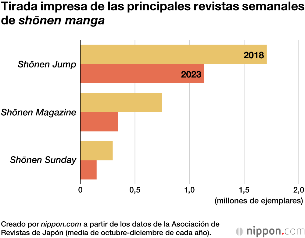 El gráfico siguiente muestra los cambios en la tirada impresa de las principales revistas semanales de shōnen manga. Magazine y Sunday han visto cómo su difusión impresa se reducía casi a la mitad en los últimos cinco años.