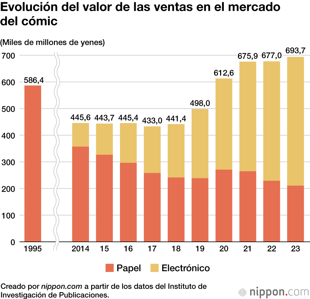 Si observamos las tendencias recientes, el manga en papel experimentó un crecimiento significativo en 2020 y 2021, pero comenzó a descender en 2022, y en 2023 las ventas fueron incluso inferiores a las de 2019, el año anterior a la pandemia del nuevo coronavirus. Por el contrario, el mercado del cómic electrónico casi ha duplicado su tamaño con respecto a 2019.