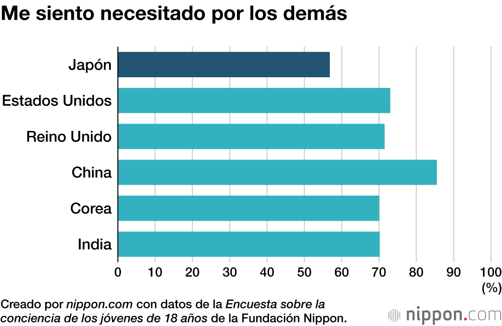 La proporción de encuestados que respondieron afirmativamente a las preguntas “¿Se siente necesitado por los demás?” y “¿Se siente orgulloso de la personalidad que tiene?” también se situó por debajo del 60 % en Japón, cifra significativamente inferior a la de otros países.