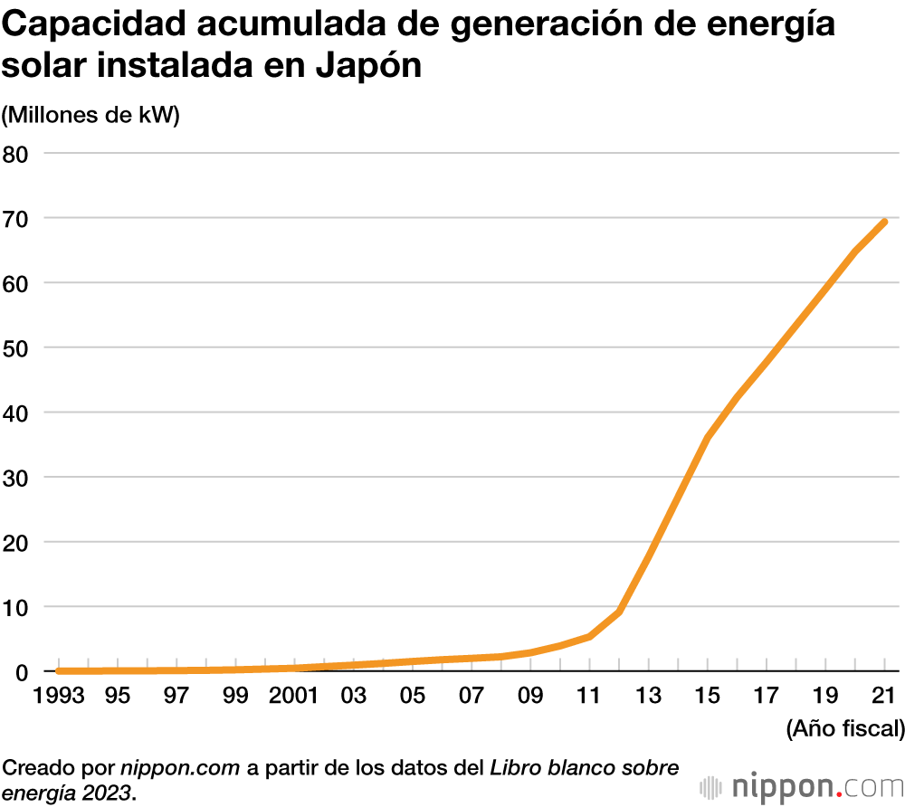 Según los últimos datos publicados en el Libro blanco sobre energía del año fiscal 2023, la capacidad total instalada para generar energía solar era de 69,35 millones de kilovatios en el año fiscal 2021. La capacidad estimada era solo de 5 millones de kW en el ejercicio fiscal 2011, pero después de la adopción del sistema de compra por tarifa de energía renovable (o FIT, del inglés “Feed-in Tariff”) al año siguiente, hubo un súbito aumento de la instalación de paneles solares en viviendas particulares, así como de megaproyectos solares, lo que condujo a que la capacidad de generación de energía solar aumentase más de diez veces durante la siguiente década. Entre otros factores responsables de este incremento está también la reducción de los costes que trajeron las mejoras en la tecnología.