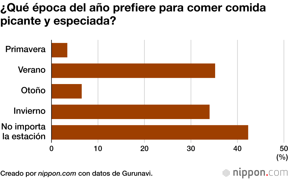 La mayor proporción de encuestados (42 %) afirmó que la estación del año no es importante para comer comida superpicante, pero por estaciones, el 35 % de los encuestados dijo que el verano es la época preferida para comerla, ligeramente más que el invierno (34 %).