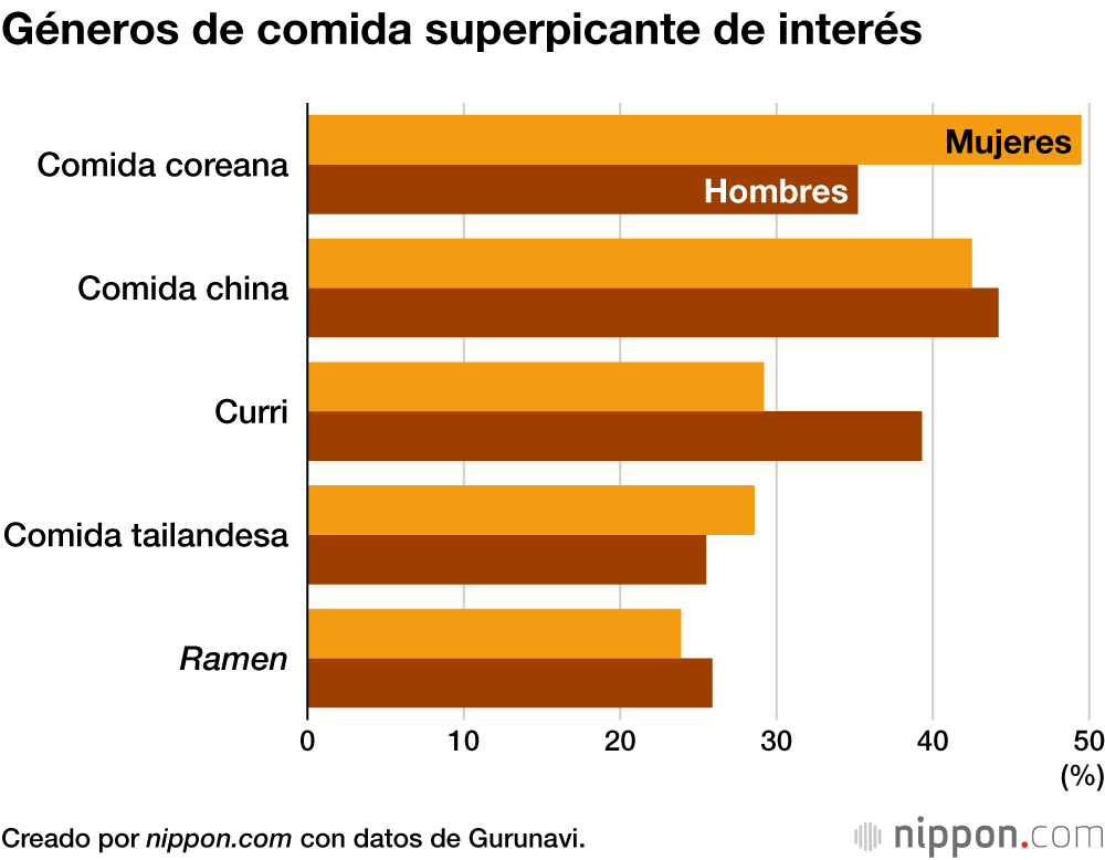 Casi la mitad de las mujeres citaron la comida coreana como género gastronómico de interés. Esto sugiere que muchas mujeres se interesan por la comida coreana a través de las teleseries y los ídolos mediáticos, ahora que se dice que estamos en el cuarto boom coreano. Muchos hombres citaron la comida china y el curri.