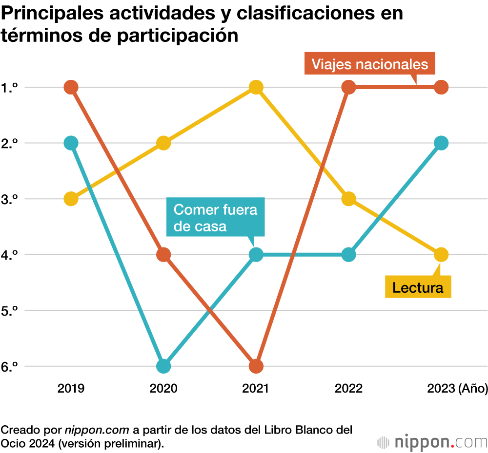 Según el Libro Blanco del Ocio 2024 (versión preliminar) publicado recientemente por el Centro de Productividad de Japón, “Hacer turismo nacional (para escapar del calor o el frío, por ejemplo, o visitar zonas de aguas termales)” ocupó el primer puesto por segundo año consecutivo, y representó el 48,7 % de todas las actividades de ocio mencionadas por los encuestados en 2023. “Comer fuera de casa (excluyendo las comidas que formaban parte de actividades cotidianas)” ocupó el segundo lugar, con un 39,2 %, dos puestos por encima que el año anterior, seguido de “Ver vídeos (de alquiler y distribución digital)”, con un 37,0 %, “Leer (como entretenimiento)”, con un 36,3 %, “Escuchar música (de distribución digital, CD, vinilos, etc.)”, con un 34,5 %, y “Conducir”, con un 32,7 %. Solo un 5,3 % indicó “Viajar al extranjero”.