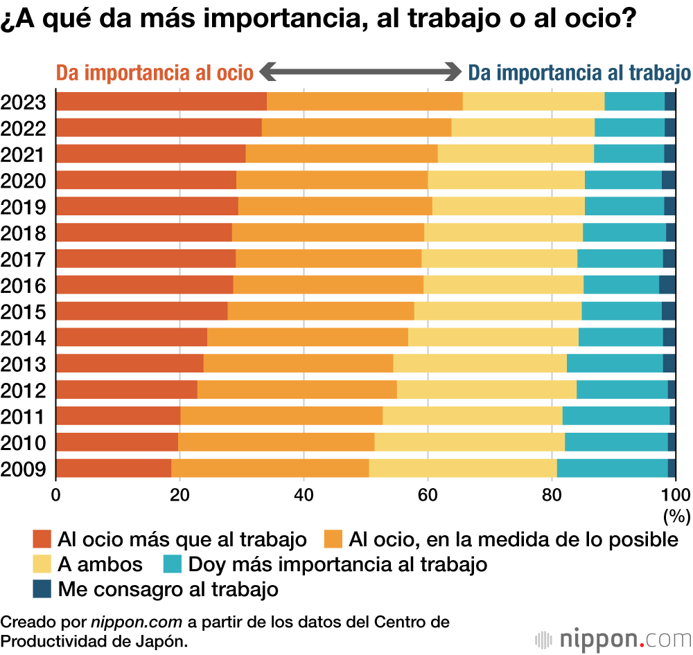 A la pregunta de si es más importante el trabajo o el ocio, el 65,7 % de los encuestados afirmaba “tratar de sentirse realizado/a en el ocio, más que en el trabajo” (34,1 %) o “disfrutar del ocio al máximo posible esforzándose en el trabajo” (31,6 %). Se trata de la proporción más alta desde 2009, cuando se disponía de cifras comparables. El 22,9 % afirmaba dedicar el mismo esfuerzo al trabajo y al tiempo de ocio, mientras que el 9,7 % dijo disfrutar a veces del tiempo de ocio, pero dedicar más esfuerzo a su trabajo.