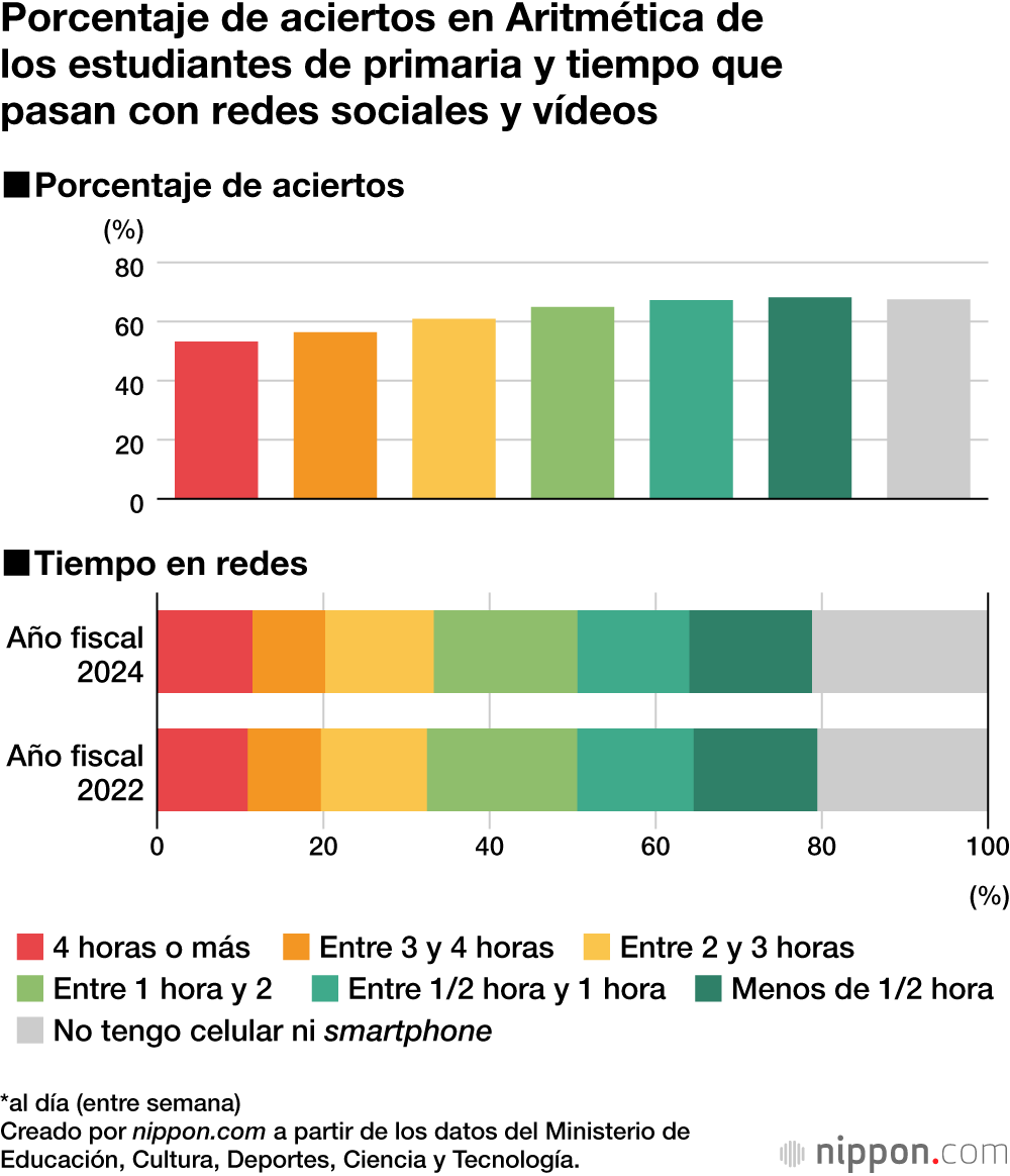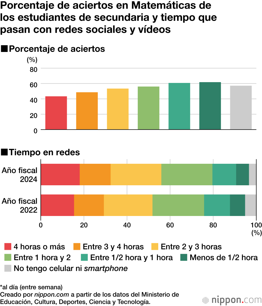 Una encuesta realizada a estudiantes de sexto curso de primaria y tercero de secundaria de todo Japón en abril de 2024 reveló que el tiempo que pasaban en redes sociales o viendo videos en internet había aumentado con respecto al año fiscal 2022. Esta encuesta se llevó a cabo al mismo tiempo que la Evaluación nacional de rendimiento académico. Los resultados sugieren una tendencia entre los estudiantes: cuanto más tiempo pasan en redes sociales, más disminuyen sus aciertos en los exámenes.