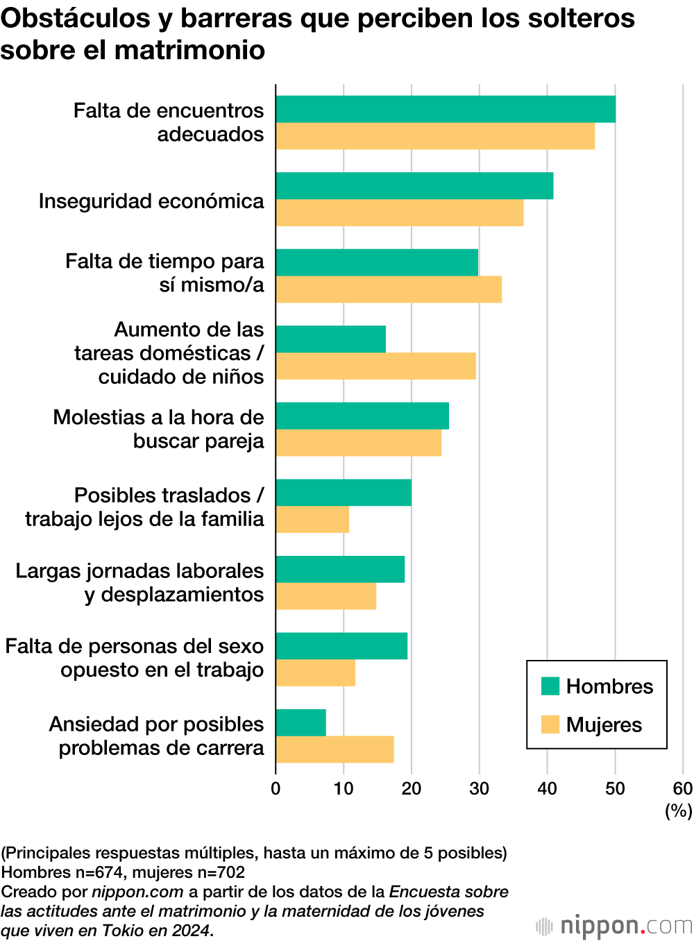Según la Encuesta sobre actitudes ante el matrimonio y la maternidad de los jóvenes que viven en Tokio en 2024, realizada y publicada recientemente por primera vez por la Cámara de Comercio e Industria de Tokio, el 78,7 % de los solteros respondieron positivamente a la idea del matrimonio, afirmando que tienen intención de casarse en algún momento. Por otro lado, el 50,1 % de los hombres solteros y el 47,0 % de las mujeres solteras dijeron que el principal obstáculo para el matrimonio era la falta de encuentros adecuados. Esta cifra es superior al porcentaje de hombres (40,9 %) y mujeres (36,5 %) solteros que afirmaron tener inseguridades económicas.