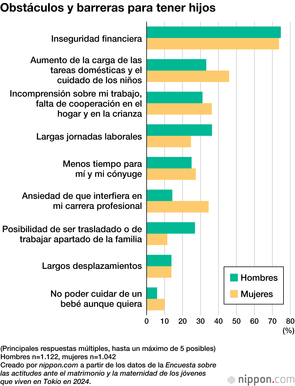 El mayor obstáculo para tener hijos era la “inseguridad financiera”, con un 74,1 % de todos los encuestados, muy por delante del resto de respuestas. Mientras que a las mujeres les preocupa el aumento de la carga que suponen las tareas domésticas y el cuidado de los hijos, a los hombres les preocupan más las largas jornadas laborales y la posibilidad de ser trasladados a otra ciudad o de trabajar apartados de la familia, lo que indica una mentalidad de reparto de roles entre hombres y mujeres. También son más las mujeres que se preocupan por posibles obstáculos a sus carreras.