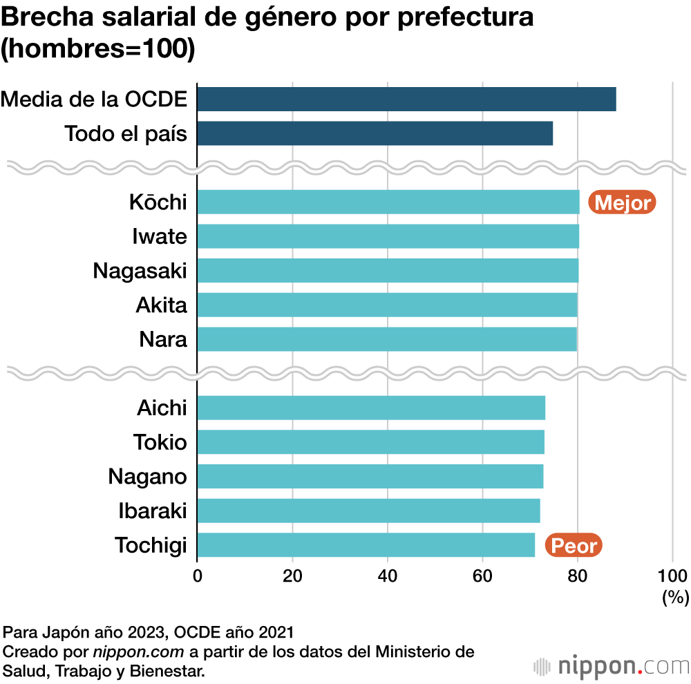 Según el informe, la prefectura de Tochigi registró la mayor diferencia, con un 71,0 %, mientras que Kōchi presentaba la menor, con un 80,4 %, una diferencia de casi 10 puntos porcentuales. Tokio ocupó el cuarto peor lugar, con un 73,0 %; la media del país fue del 74,8 %. En los países desarrollados de la Organización para la Cooperación y el Desarrollo Económicos (OCDE) la media es del 88,1 % (2021), por lo que la brecha salarial en Japón sigue siendo grande.