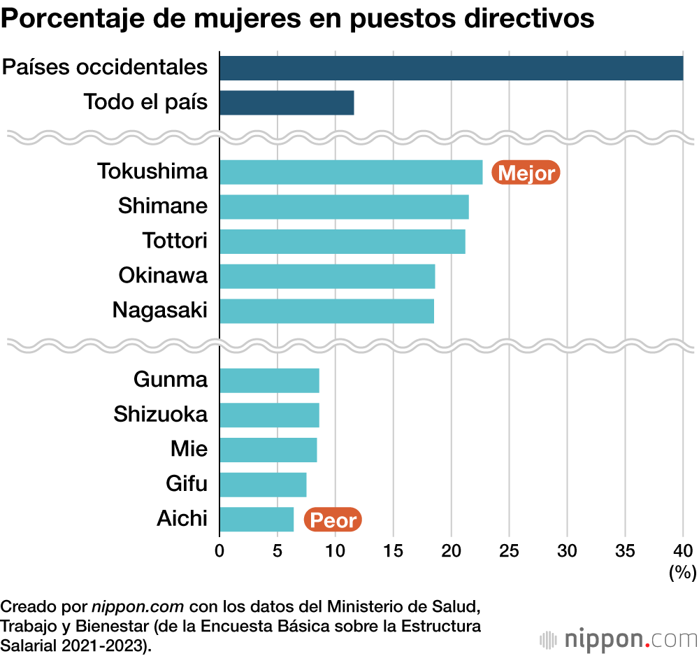 En cuanto a la proporción de mujeres en puestos directivos, el 11,6 % de Japón está muy por debajo del nivel de los países occidentales, que ostentan cerca de un 40 %. La peor clasificación prefectural es la de Aichi, con un 6,4 %, seguida de Gifu, Mie y Shizuoka, todas ellas en el área central del país.