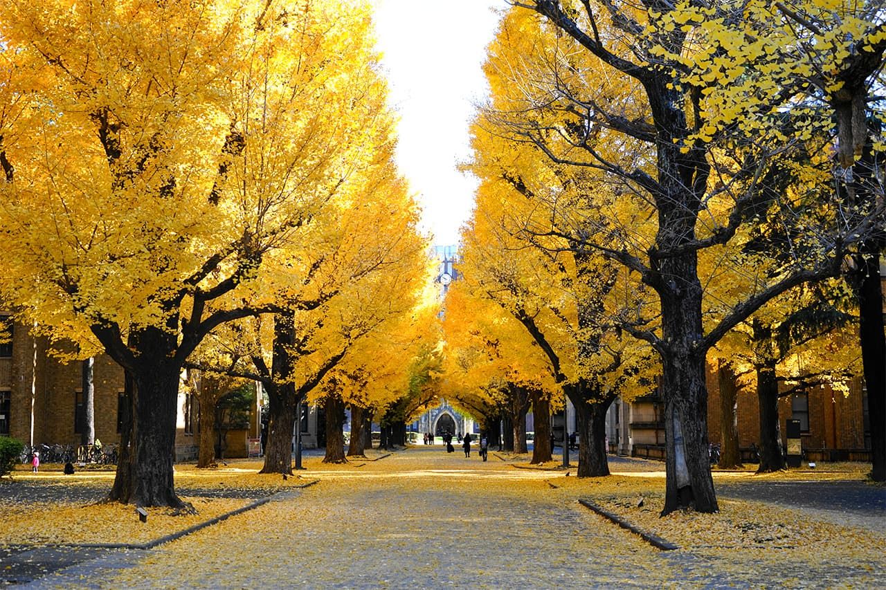 Los ginkgos, representativos del otoño de las metrópolis, son parte del paisaje de avenidas o parques. Sus alfombras doradas se extenderán por parques y calles entre mediados y finales de noviembre en Tōhoku y regiones más meridionales.