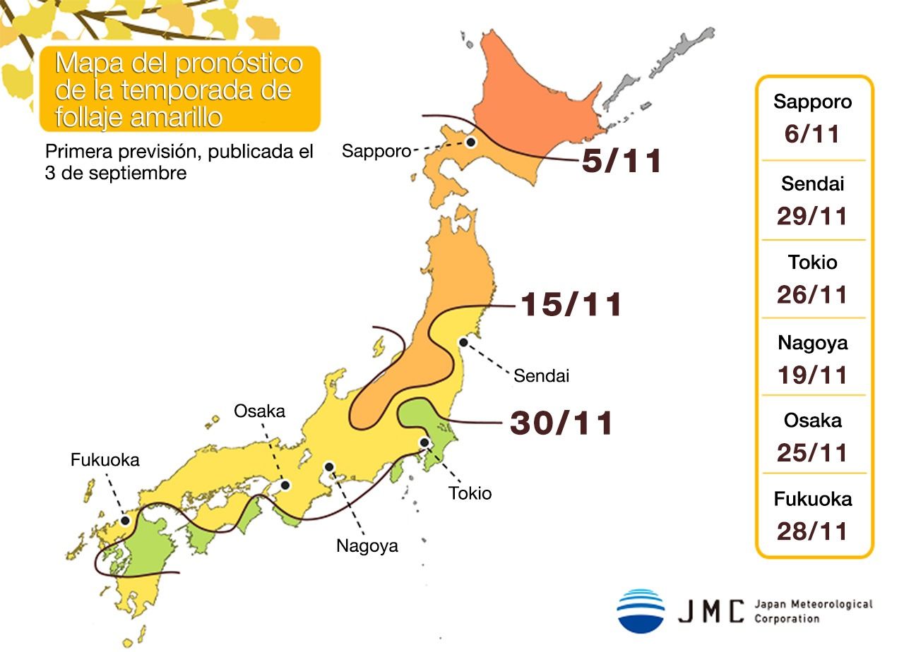 Pronóstico de la temporada de follaje amarillo para las principales ciudades de Japón 2024