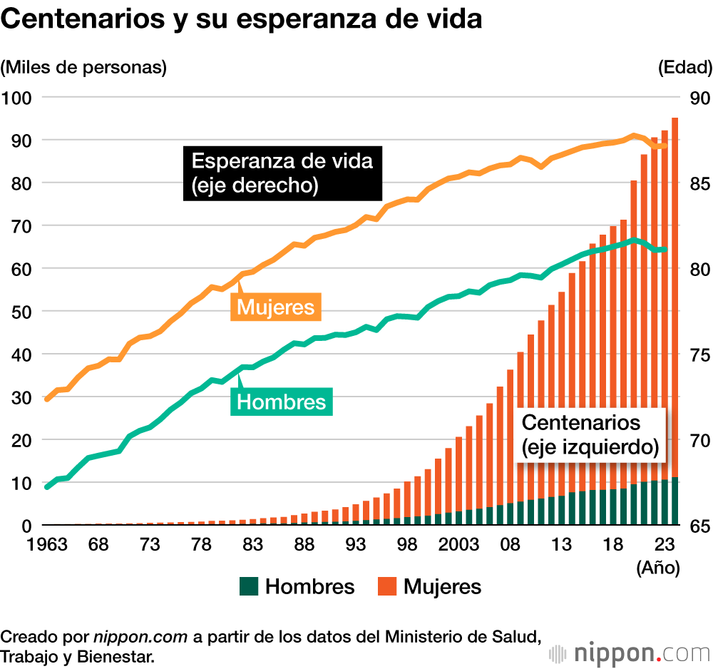 A 1 de septiembre de 2024, el número de personas de 100 años o más, según el Registro Básico de Residentes, aumentó en 2.980 respecto al año anterior, situándose en 95.119. El número de personas de cien años o más lleva 54 años aumentando. La inmensa mayoría eran mujeres: un 88,3 % del total.