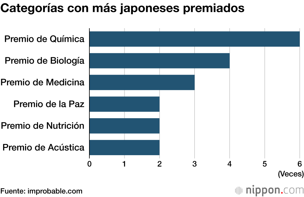 La categoría en la que más han triunfado los japoneses hasta la fecha es la de Química (seis galardones), seguida de Biología (cuatro) y Medicina (tres).