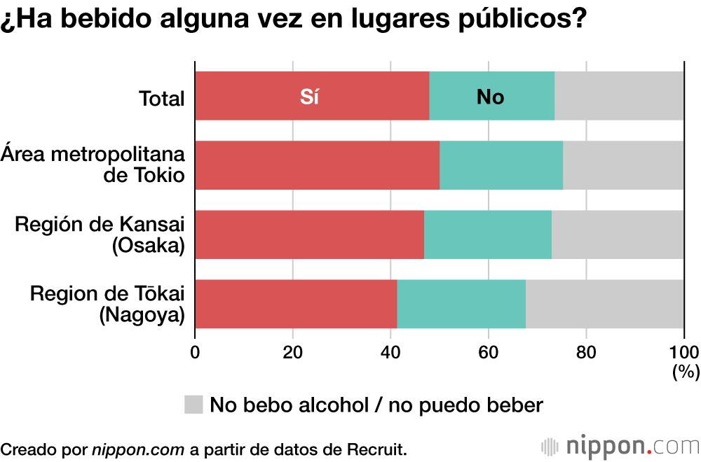 A principios de agosto, el instituto de investigación Hot Pepper Gourmet Research de Recruit realizó una encuesta sobre el consumo de alcohol al aire libre en espacios públicos, como parques y calles. Entre los 8.016 encuestados, el 47,9 % afirmó haber bebido alguna vez alcohol al aire libre en espacios públicos, mientras que el 25,6 % afirmó no haberlo hecho nunca. Sin embargo, dado que el 26,5 % indicaba que no podía beber o no bebía, esto significa que el 65 % de los encuestados que beben alcohol lo han hecho en alguna ocasión en espacios públicos.