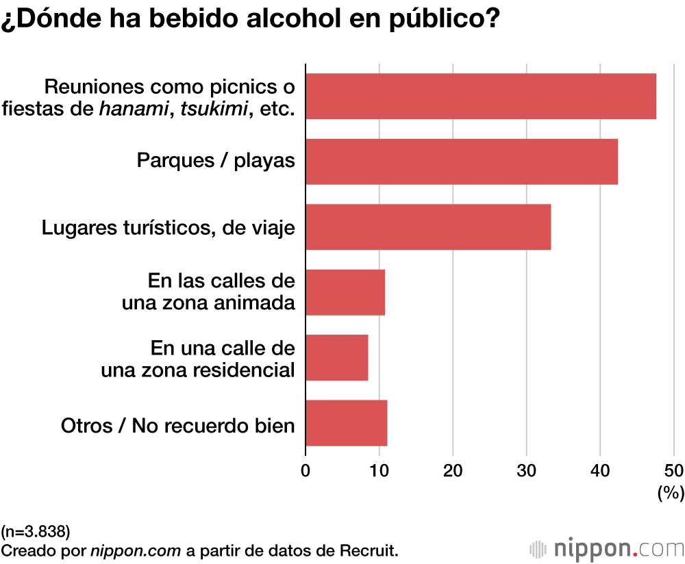 Los tres lugares más comunes donde la gente había bebido alcohol al aire libre eran en “eventos como picnics o fiestas de hanami y tsukimi” (47,6 %), “en el parque o en la playa” (42,4 %) y “en lugares turísticos, de viaje” (33,3 %). Las personas con las que bebían eran principalmente “amigos y conocidos” (55,4 %) o “familiares y parientes” (36,6 %).