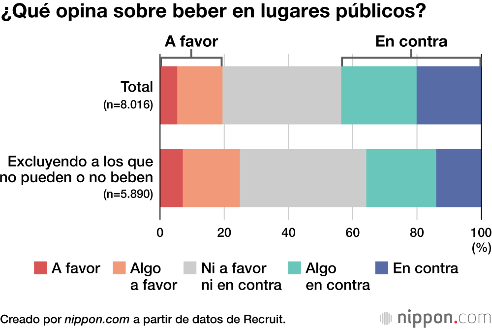Cuando se les preguntó su opinión sobre beber en espacios públicos al aire libre, el porcentaje de los que estaban a favor, incluidos los que respondieron “algo a favor”, fue del 19,9 %, mientras que los que estaban en contra, incluidos los que decían estar “algo en contra”, fueron más del doble, con un 43,3 %.
