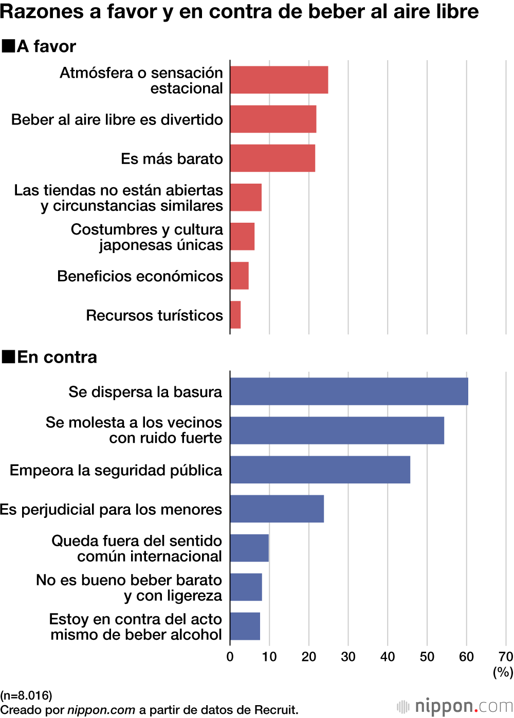 Entre las principales razones por las que los encuestados apoyan el consumo de alcohol al aire libre se encuentran las ventajas para los que beben, como la “atmósfera o la sensación estacional”, así como el hecho de que es “divertido beber al aire libre” y “más barato”. En cambio, las tres principales razones para estar en contra se relacionan con la influencia que se ejerce sobre el entorno: “se dispersa la basura” (60,4 %)”, “se molesta a los vecinos con ruido fuerte (54,3 %)” y “empeora la seguridad pública (45,7 %)”.