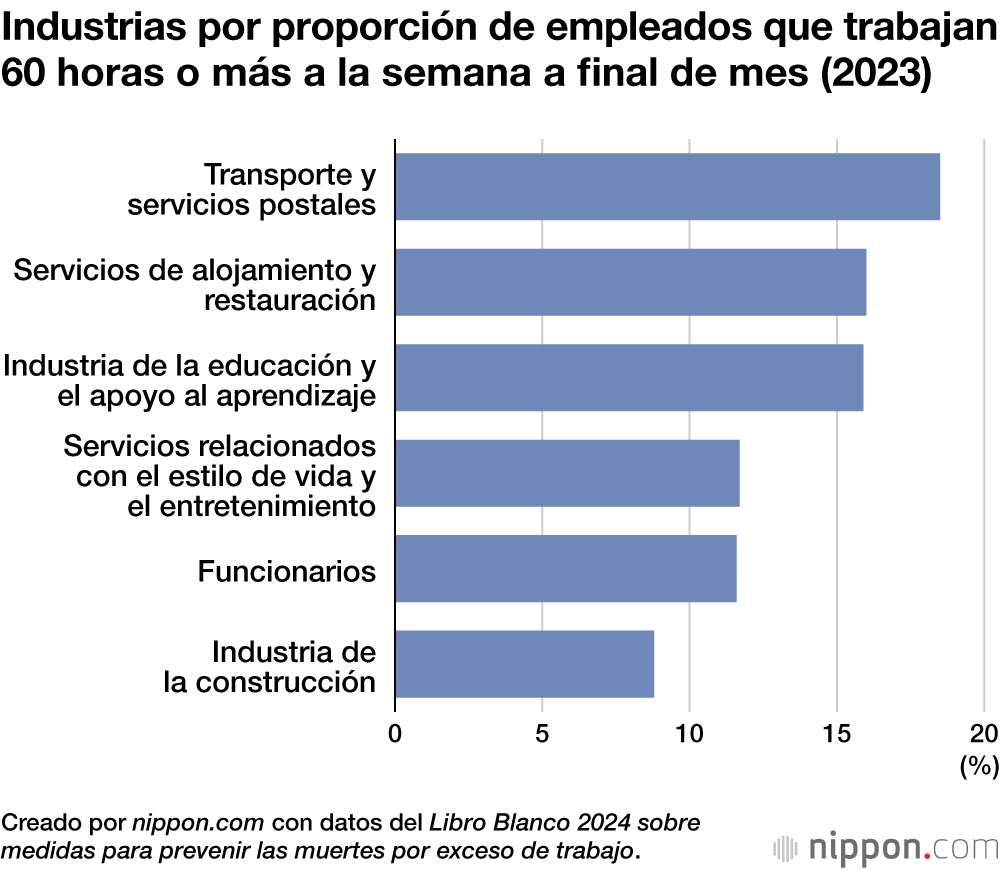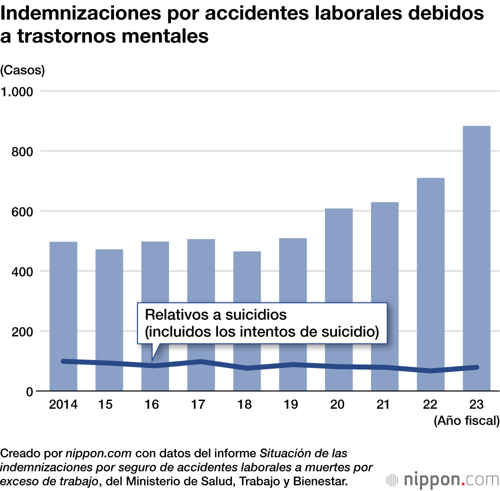 Según el Libro Blanco 2024 sobre medidas para prevenir las muertes por exceso de trabajo (decisión del Consejo de Ministros del 11 de octubre), en 2023 se reconocieron como casos de accidente laboral a 883 personas que sufrieron algún trastorno mental causado por el exceso de trabajo, lo que supone un aumento de 173 personas respecto al año anterior y la cifra más alta de la historia. De ellas, 79 personas se suicidaron o trataron de hacerlo. El número de personas reconocidas como casos de accidente laboral por dolencias cerebrales y cardíacas superó las 200 por primera vez en cuatro años, con 216 personas.