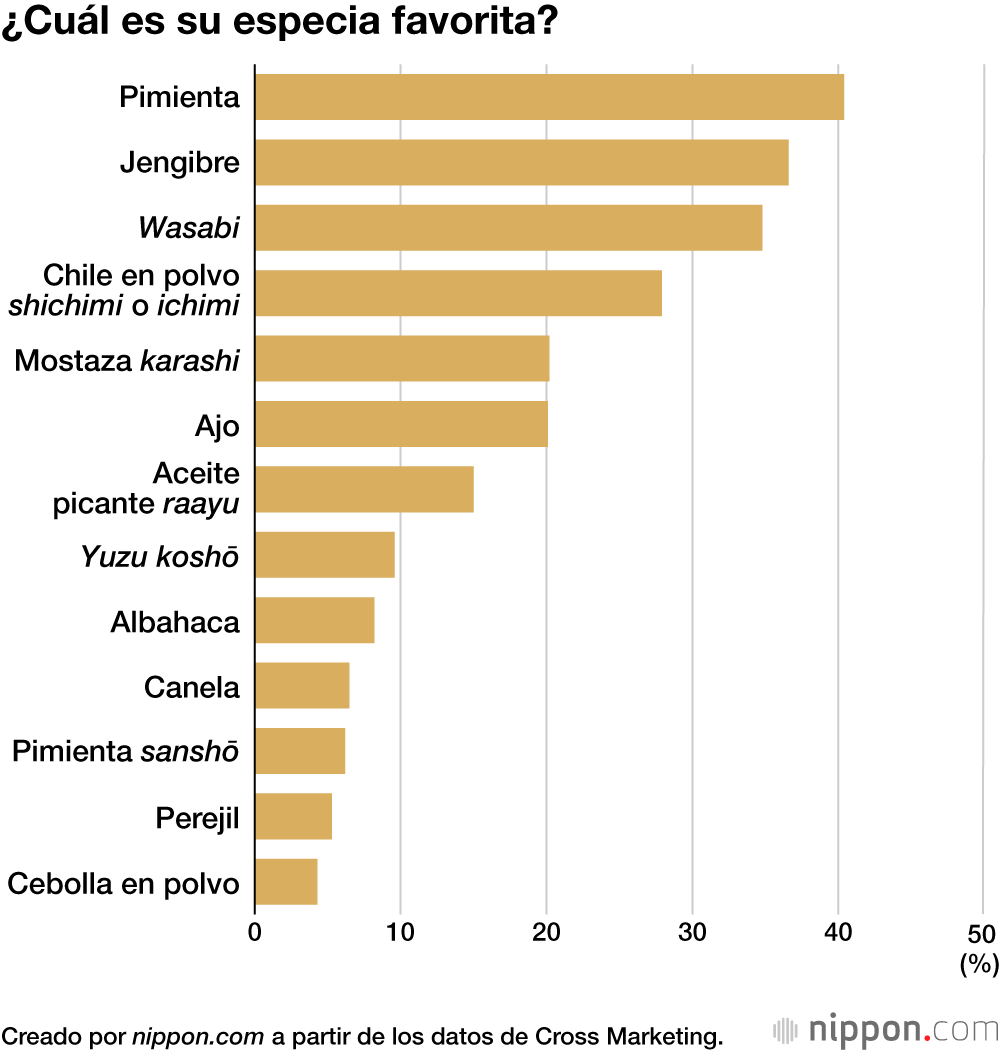Para conocer las especias favoritas de los japoneses, la empresa de sondeos Cross Marketing (con sede en el distrito de Shinjuku, Tokio) llevó a cabo una encuesta entre 1.100 personas de ambos sexos con edades comprendidas entre los 20 y los 69 años en todo Japón. La pimienta fue la que obtuvo más votos con un 40,4 %.