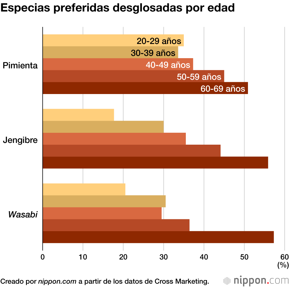 A esta le siguieron el jengibre con un 36,6 %, el wasabi con un 34,8 % y los chiles (pimientos) en polvo shichimi e ichimi con un 27,9 %, lo que revela que las especias tradicionales de Japón son también muy populares. La pimienta sanshō, acompañamiento indispensable de la anguila asada en salsa de soja endulzada (kabayaki), obtuvo solo un 6,2 %.