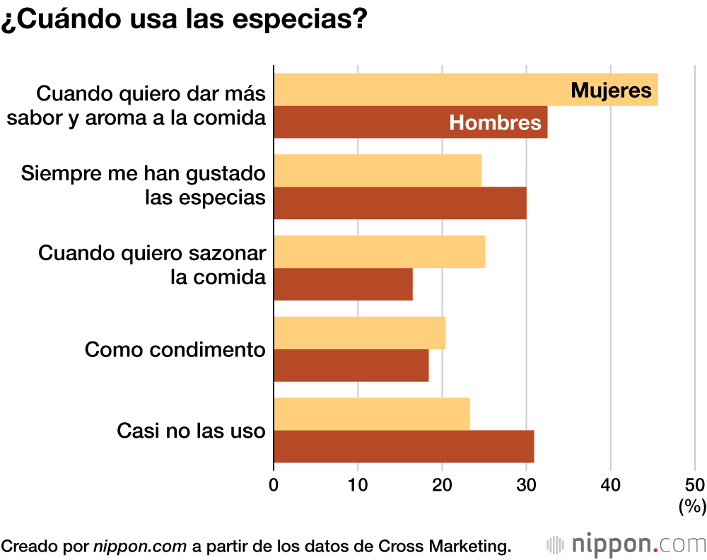 Con respecto a qué uso dan a las especias, la respuesta más elegida fue “cuando quiero dar más sabor y aroma a la comida” con un 39,1 %, seguida de “siempre me ha gustado la comida con especias” con un 27,4 %. La tercera respuesta más popular fue “las uso como sazonador” con un 20,8 %. Desglosado por sexos, las mujeres superaron a los hombres por más de 10 puntos en la respuesta “cuando quiero dar más sabor y aroma a la comida”, mientras que los hombres superaron por aproximadamente en 10 puntos a las mujeres en la respuesta “casi no las uso”.