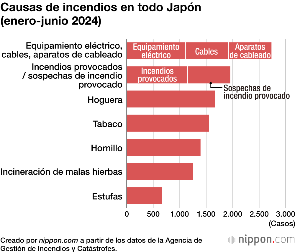 Según las estadísticas de incendios de la Agencia de Gestión de Incendios y Catástrofes, de todas las causas de incendios en todo el país entre enero y junio de este año, las tres primeras causas –“equipos eléctricos”, “cableado telefónico y de luz eléctrica” y “aparatos de cableado”- sumaban 2.732 casos. Esto supuso el 14 % del total, la proporción más alta de todos los incendios. De las diez principales causas de incendio, solo estos tres elementos y las estufas han aumentado respecto al año anterior.