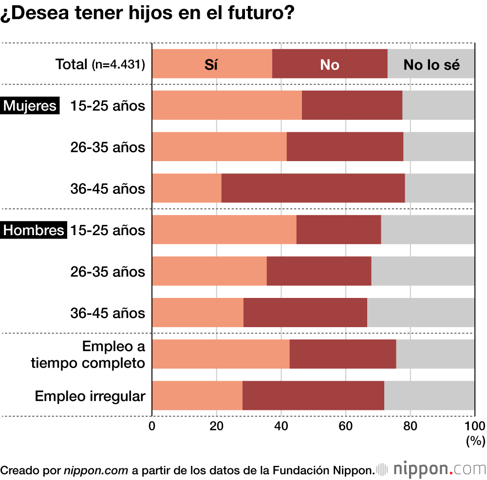 En una encuesta realizada por la Fundación Nippon a 6.000 personas de entre 15 y 45 años de todo Japón sobre su actitud ante el descenso de la natalidad, entre las 4.431 personas que no tenían hijos, el 37 % sí quería tenerlos, mientras que el 36 % no quería o no le importaba tenerlos, unos porcentajes realmente nivelados.