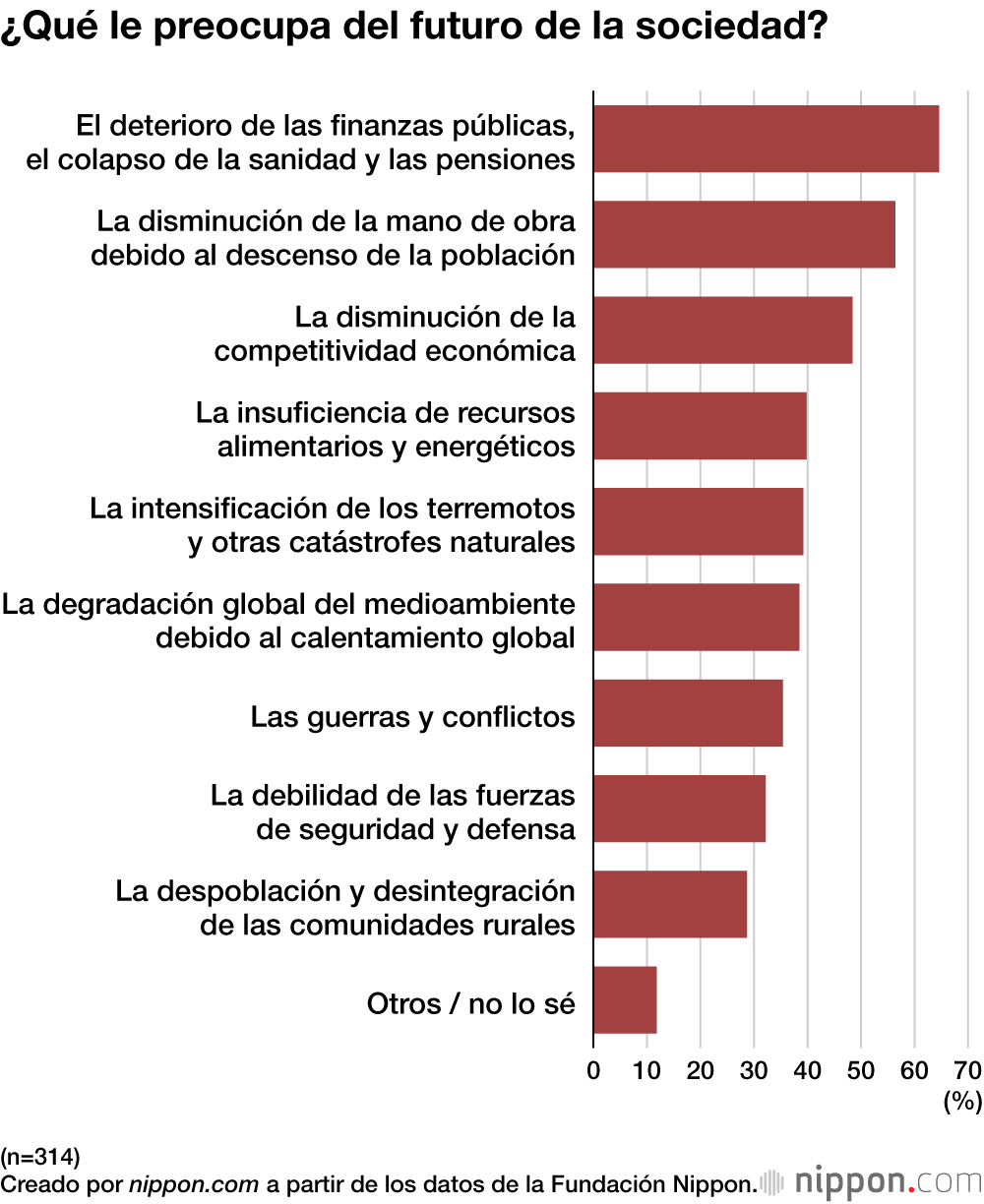 De los 1.580 encuestados que “no quieren o no les importa” tener hijos, hubo 314 que dijeron estar “preocupados por el futuro de la sociedad (en la que tendrían que vivir esos hijos); a ellos se les preguntó por los aspectos concretos de sus preocupaciones, y la respuesta más común fue “el deterioro financiero, el colapso de la sanidad y las pensiones”, con un 65 %, seguida del “descenso de la población activa debido a la disminución de la población”, con un 56 %, y del “descenso de la competitividad económica”, con un 48 %. La preocupación por el descenso del poder económico y social debido al declive de la población puede considerarse un círculo vicioso que conducirá a un mayor declive de la población.