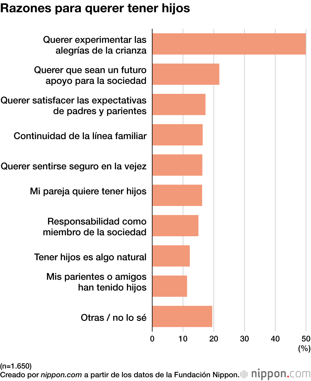 De los 1.650 encuestados que “desean tener hijos”, la razón más destacada fue “experimentar las alegrías de la crianza” (50 %), seguida de “apoyar a la sociedad en el futuro” (22 %). También había cierta conciencia del sistema familiar, ya que el 17 % quería “cumplir las expectativas de padres y parientes” y el 16 % deseaba “la continuación de la línea familiar”.
