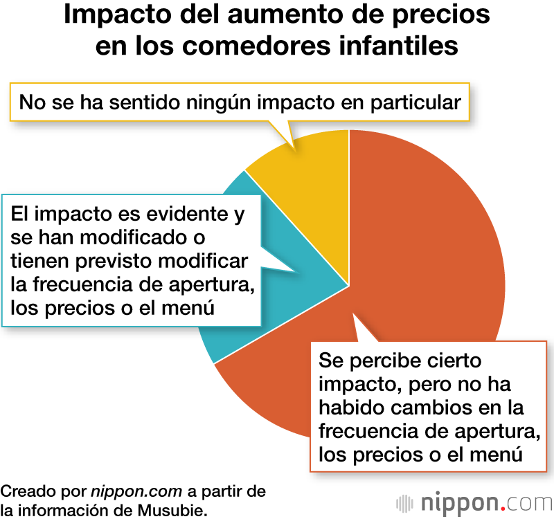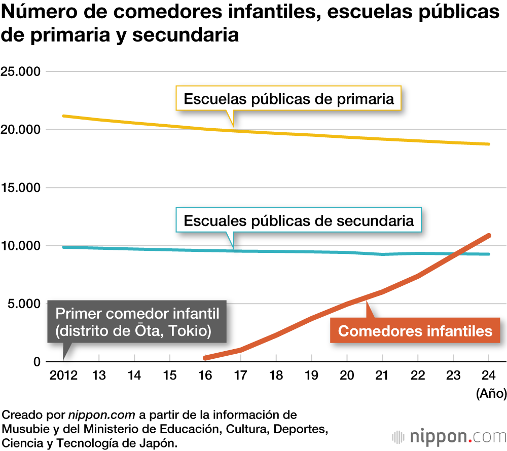 Según estadísticas de Musubie, una organización sin ánimo de lucro que brinda apoyo a comedores infantiles de todo Japón, en el ejercicio fiscal 2024 el número (preliminar) de comedores infantiles en el país ascendió a 10.866. Esto representa un aumento de 1.734 con respecto al ejercicio fiscal anterior, y la primera vez que se supera los 10.000. Esta cifra también está por encima del número de escuelas públicas de secundaria (9.265). De continuar este ritmo de crecimiento, para 2029 podría superar el número de escuelas públicas de primaria de todo el país.