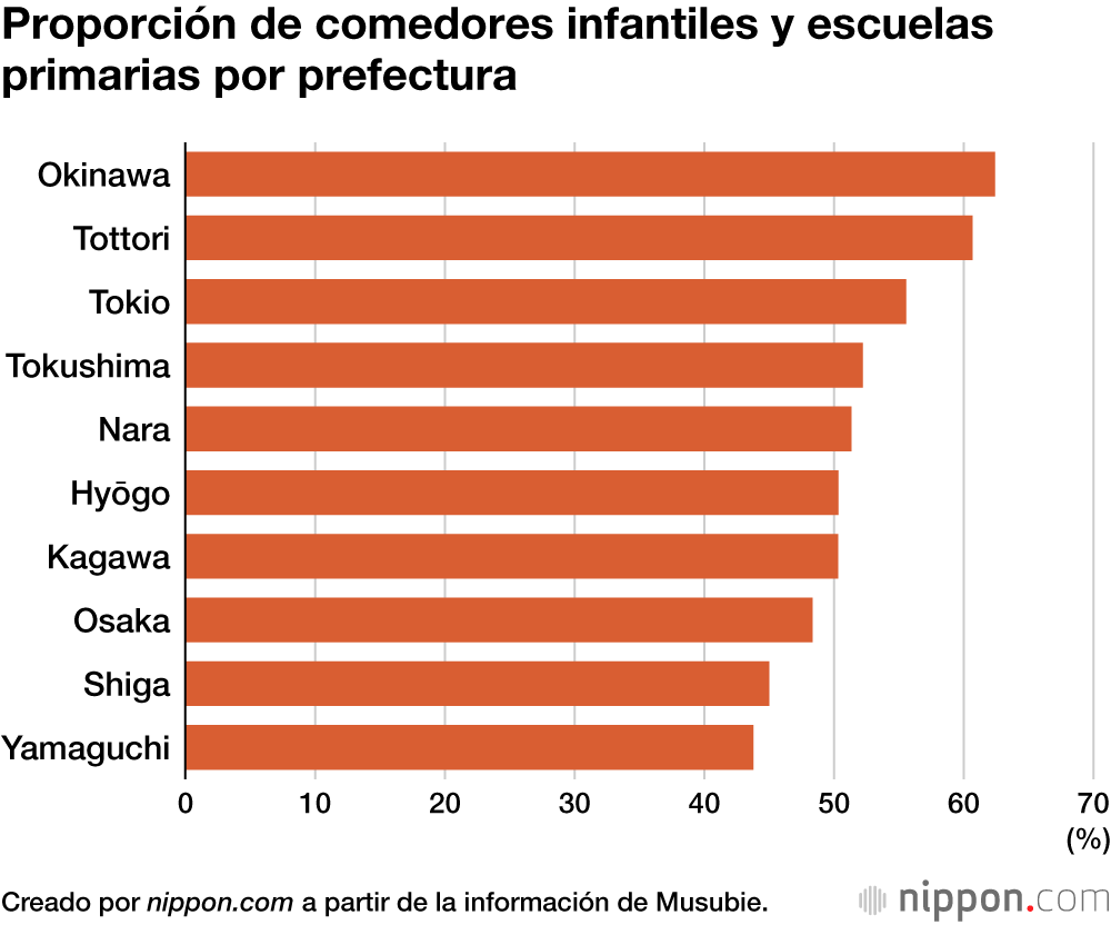 La proporción de comedores infantiles sobre el número total de escuelas primarias, en promedio nacional, es del 34,66 %. Por prefecturas, la lista la encabeza la prefectura de Okinawa, cuyo Gobierno da un robusto apoyo a los comedores, seguida de las de Tottori y Tokio, en segundo y tercer lugar respectivamente. Un voluntario que gestiona un comedor infantil en la región de Kyūshū cuenta que en algunos casos los habitantes locales manifiestan que no quieren que haya lugares donde se reúnan solo los niños sin recursos, algo que dificulta la apertura de los comedores, lo cual revela que en algunas zonas no se ha conseguido una comprensión suficiente del problema.