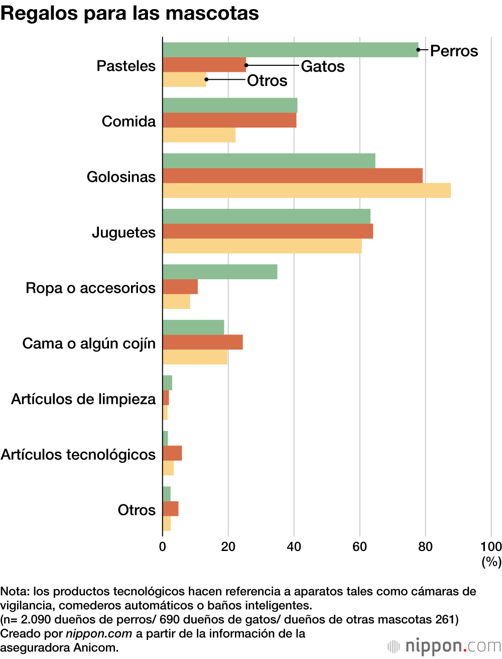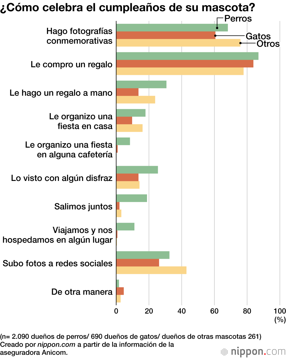 Con respecto a los regalos, la mayoría respondió que compraba alguna golosina o juguetes. En los hogares con perros, muchas personas respondieron que compraban un pastel de cumpleaños. Las tiendas en línea de productos para mascotas ofrecen pasteles de cumpleaños con pasta de frutas, verduras o carne que las mascotas pueden comer sin problema.