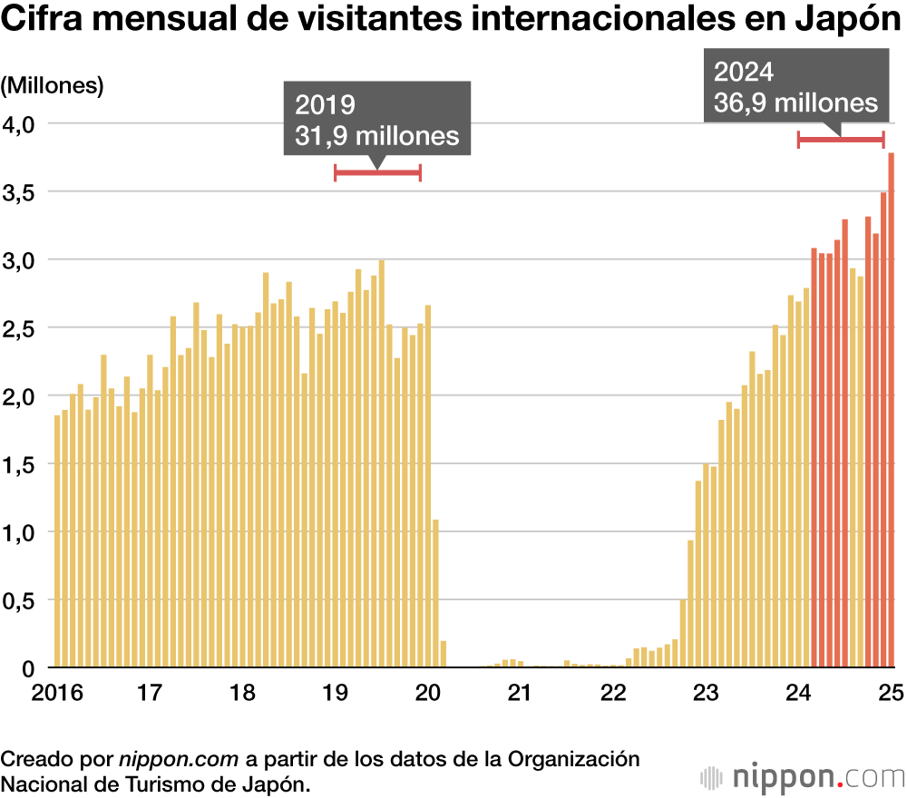 Japón recibió 3,7 millones de visitantes extranjeros en enero de 2025, una cifra histórica