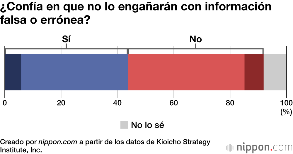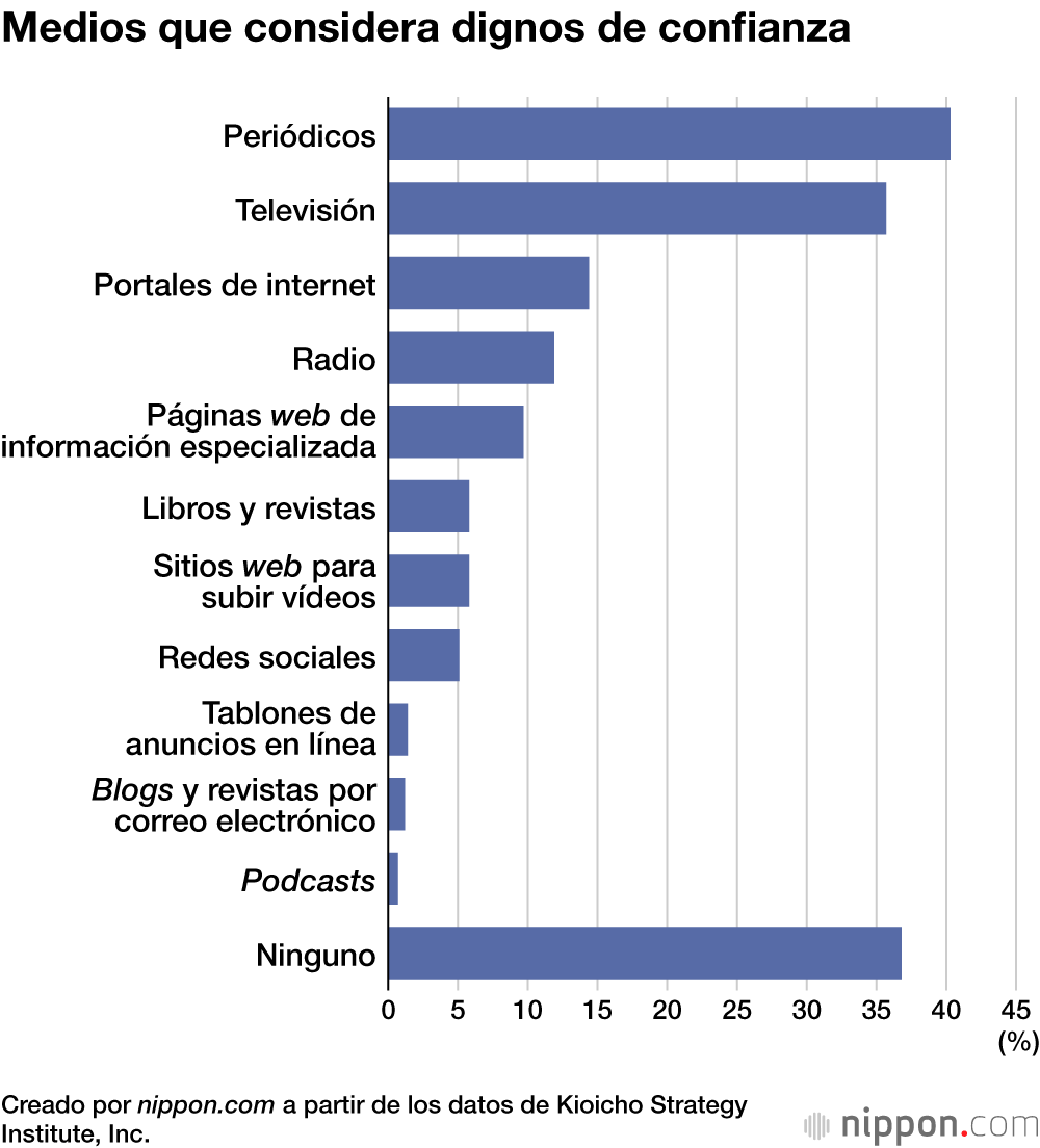 En una encuesta en línea realizada por Kioicho Strategy Institute, Inc. a mil personas de 18 años o más de todo el país, se les preguntó: “¿En qué medios confía?” (con respuesta múltiple). En las respuestas los medios tradicionales quedaron a la cabeza, con un amplio margen: los periódicos (40,3 %) y la televisión (35,7 %). El nivel de confianza en los sitios web para subir vídeos (5,8 %) y en las redes sociales (5,1 %), cada vez más influyentes, resultó ser relativamente menor.